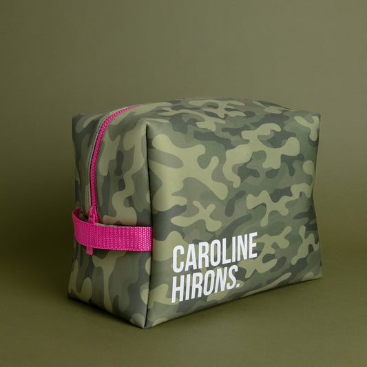 The XL Camo Kit Bag is a brand new size! Green camo with a neon pink zip and inner lining, this Kit Bag holds EVEN more skincare than you can imagine AND every edition of Caroline Hirons' Skincare books.