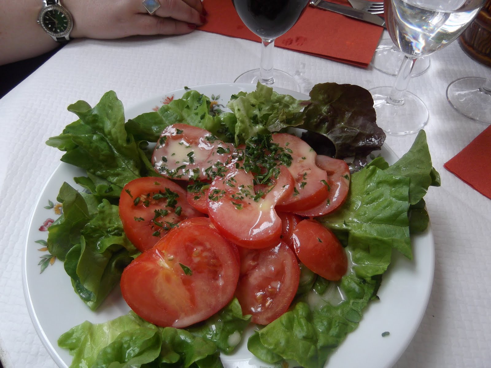 'I'm hungry from all that shopping and walking - let's stop for a snack.' Tomato salad and red wine. Obviously... |
