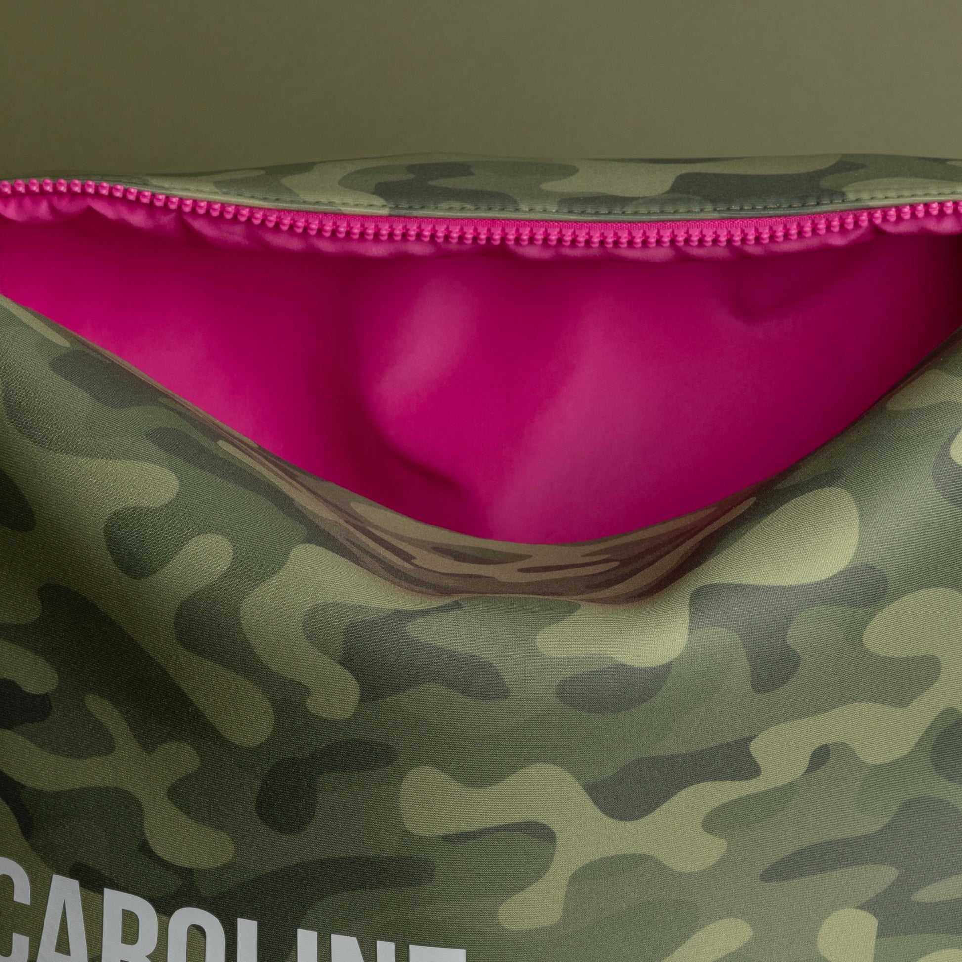 The XL Camo Kit Bag is a brand new size! Green camo with a neon pink zip and inner lining, this Kit Bag holds EVEN more skincare than you can imagine AND every edition of Caroline Hirons' Skincare books.